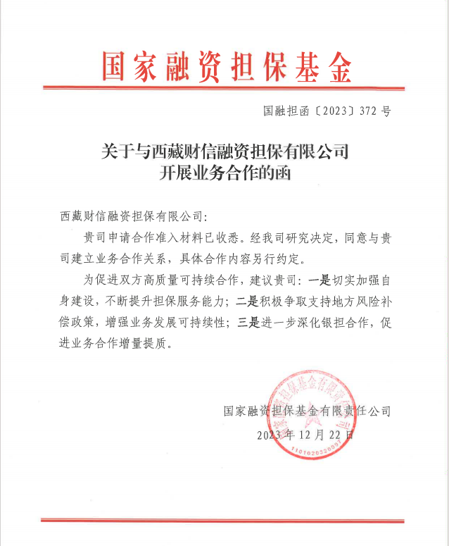 2023年12月22日,財(cái)信擔(dān)保收到國(guó)家融資擔(dān)?;鹩邢挢?zé)任公司《關(guān)于與西藏財(cái)信融資擔(dān)保有限公司開(kāi)展業(yè)務(wù)合作的函》(國(guó)融擔(dān)函〔2023〕372號(hào)),標(biāo)志著財(cái)信擔(dān)保正式加入國(guó)家融資擔(dān)保體系,成為全區(qū)唯一一家與國(guó)融擔(dān)“總對(duì)總”合作的政府性融資擔(dān)保公司,也標(biāo)志著“國(guó)家融資擔(dān)保基金-省級(jí)再擔(dān)保機(jī)構(gòu)-地方融資擔(dān)保機(jī)構(gòu)”三級(jí)風(fēng)險(xiǎn)分擔(dān)機(jī)制的正式落地實(shí)施。財(cái)信擔(dān)保與國(guó)融擔(dān)建立全面合作關(guān)系,既是自治區(qū)黨委政府、區(qū)金融監(jiān)管局、區(qū)財(cái)政廳和投資公司黨委關(guān)心支持、積極推動(dòng)的結(jié)果,更是我區(qū)政府性融資擔(dān)保行業(yè)高質(zhì)量發(fā)展具有里程碑意義的大事、喜事。